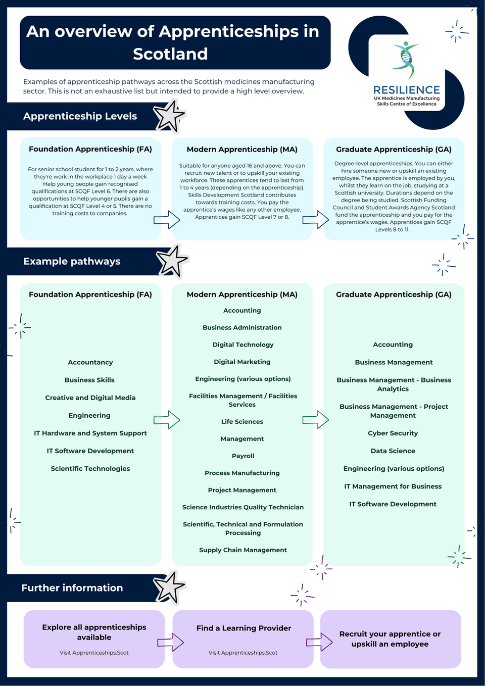 Examples of apprenticeship pathways across the Scottish medicines manufacturing sector.